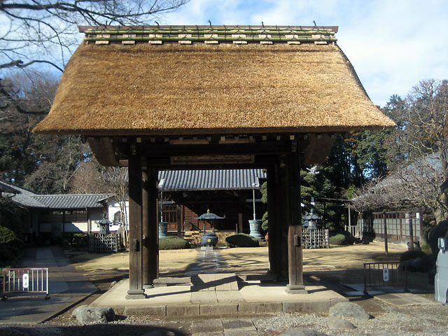 この山門は、木鼻(きばな)の絵様、形式、手法などから、江戸時代初期の建立で、典型的な江戸初期の四脚門の様式を示す貴重な建造物です。斗栱(ときょう)には簡略化が見られますが、反りのある化粧棰(けしょうたるき)、絵様付き実肘木(さねひじき)、木鼻等の渦文(うずもん)は古式で、棟飾りには地方の特徴がみられます。またこれは、通称「金剛寺の黒門」と呼ばれており、関東大震災後の修理で棰を2本取替え、昭和33年後頃の本堂修理の際に、左右の袖を取り外し、現在に至っています。
